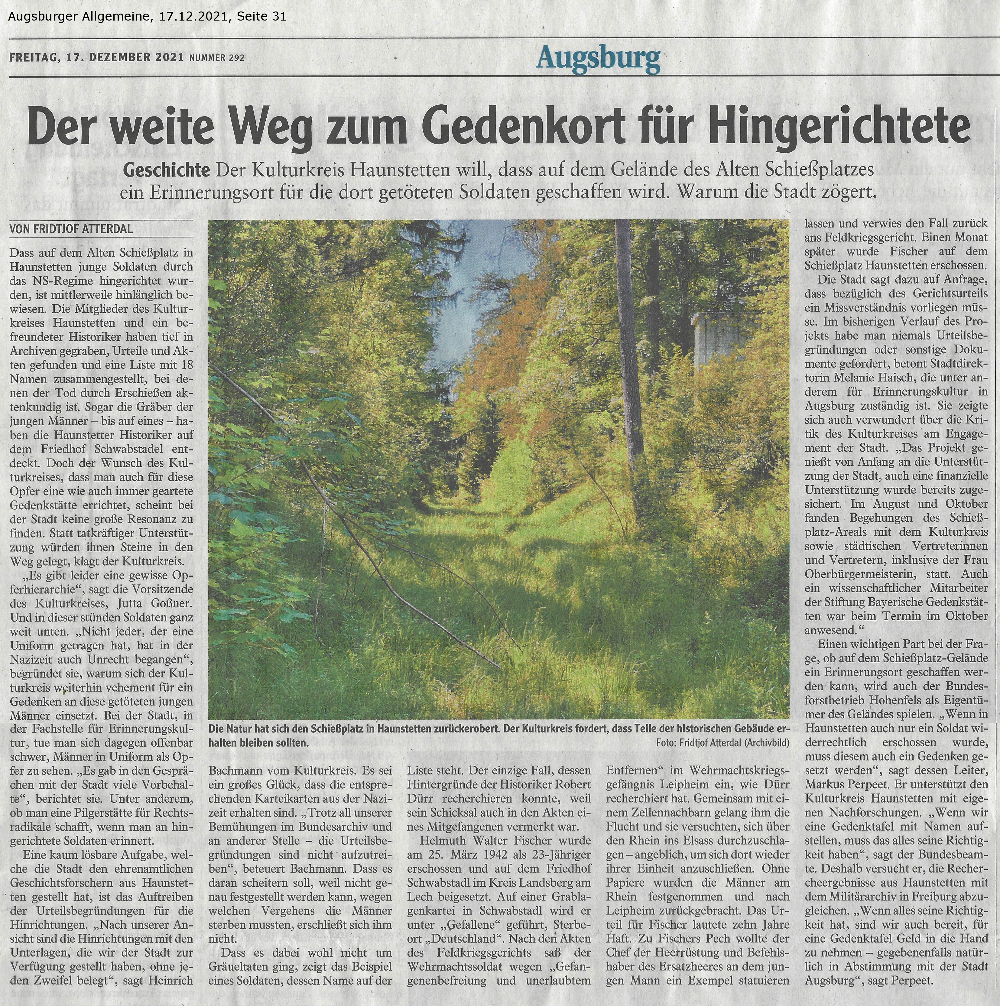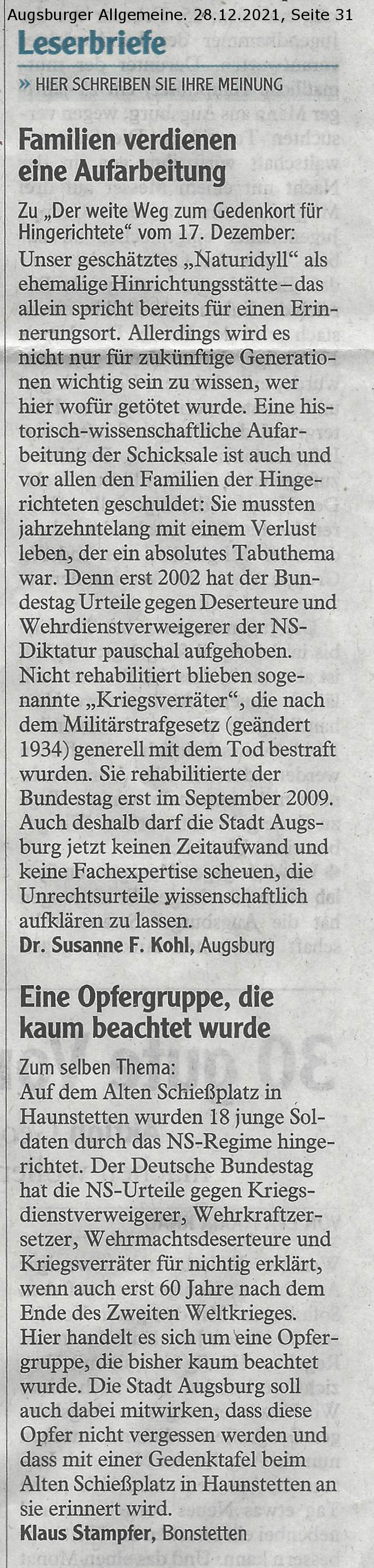 Augsburger Allgemeine vom 17. Dezember 2021, Seite 31 (=Foto-Print-Artikel) (pdf-Web-Version); Leserbriefe v. 28.12.21